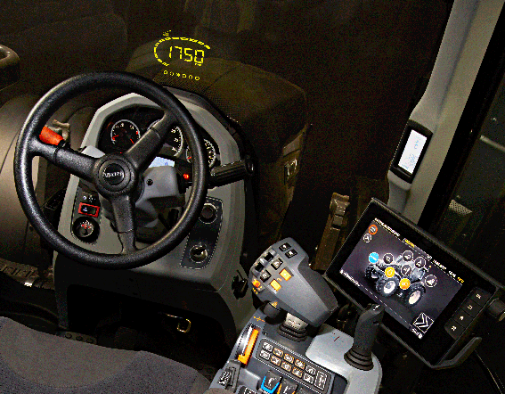 The display can be used to show information appropriate to the work being carried out but would likely include ground or engine speed, engine and hydraulics temperature, fuel and diesel engine fluid (AdBlue) level, front loader position, implement height, and so on.