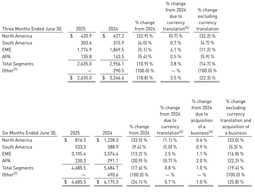 (7) “Other” represents the results for the three and six months ended June 30, 2024 for the majority of the Company’s Grain & Protein (“G&P”) business which was divested on November 1, 2024. The results of the G&P business through the date of the divestiture were previously included within our North America, South America, Europe/Middle East and Asia/Pacific/Africa segments.