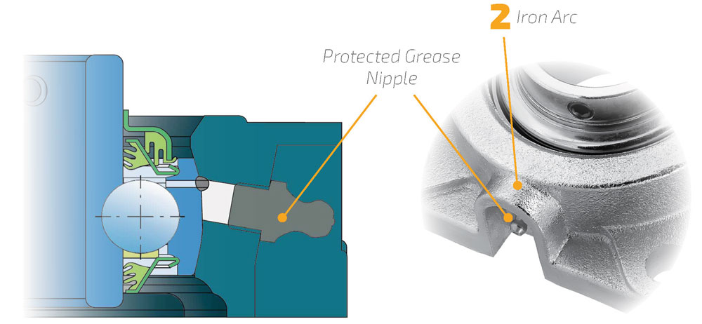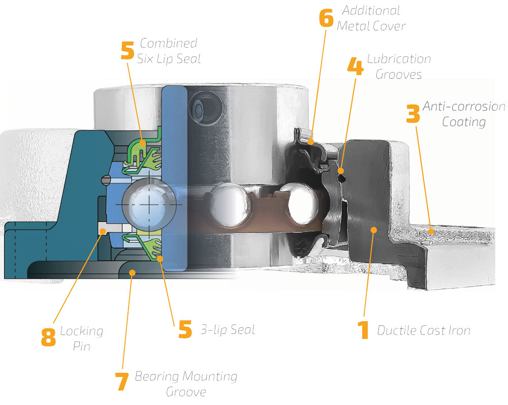 1 DUCTILE IRON HOUSING – 2.5x tensile strength more than Grey Cast Iron housing. 3 ANTI CORROSION COATING – Housing, inner ring & metal cover. 4 LUBRICATION GROOVES – In the Bearing and housing for increased grease penetration. 5 BEST SEALING SYSTEM – Front 6-lip & rear 3-lip seals. 6 ADDITIONAL METAL COVER – Protection from mechanical damage caused by stones, straw etc. 7 BEARING MOUNTING GROOVE – Located on the base of the Housing to reduce penetration of dust, mud and moisture into the Bearing. 8 LOCKING PIN – Prevents outer ring rotation & ensures centring of grease holes.