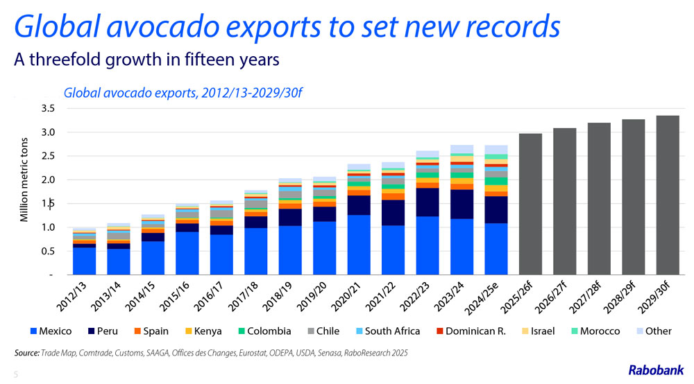 And global avocado export volumes are expanding rapidly, according to Rabobank’s Global Avocado Update 2025.