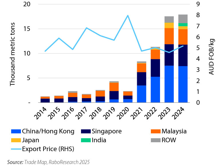 “Export volumes to the major destinations of China, Singapore and Malaysia remained almost unchanged year-on-year, while those to India increased sharply after improvements in market access,” Anna Drake revealed.