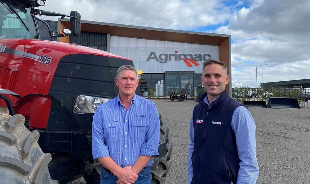 O’Connors became Case IH’s biggest dealer for AU & NZ with its purchase of Agrimac locations in Ballarat and St Arnaud VIC in 2021, taking their dealership footprint from 10 to 12 locations across three states – shown here is Agrimac Dealer Principal Hugh McEachern and O’Connors Chief Executive Officer Gareth Webb
