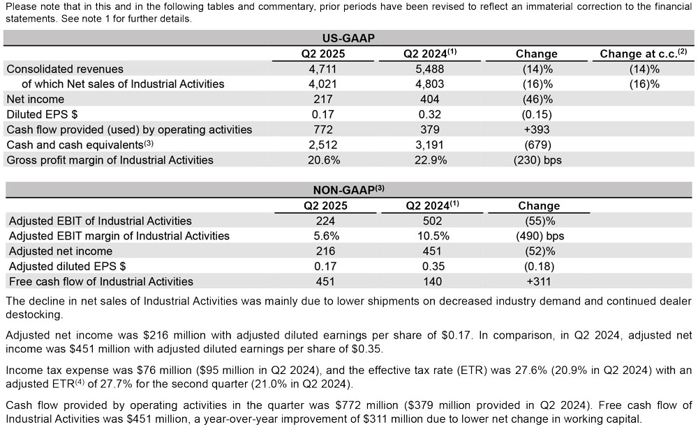 CNH Industrial, best known for its Case IH and New Holland badges, today reported sales results for the three months ended 30 June 2025, Q2, with consolidated revenue of US$4.71 billion, down 14% compared to Q2 2024, while net sales of Industrial Activities were US$4.02 billion, down 16% compared to Q2 2024.