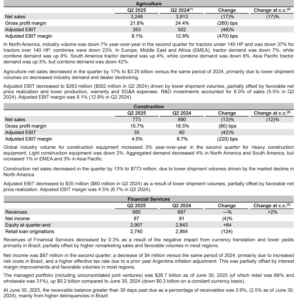 The Company is reaffirming its previous 2025 outlook: Agriculture segment net sales down between 12 and 20% year-over-year, including -1% of currency translation effects. Agriculture segment adjusted EBIT margin is between 7 and 9%.