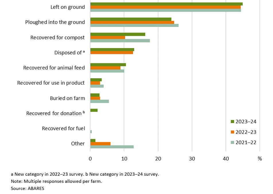 Crop loss/waste was also recovered for compost for 16% of farms, up from 10% in season 2022-23, while other categories were likewise roughly unchanged including disposed of, for example by binning, burning or dumping on 13% of farms, recovered for animal feed at 11%, recovered for use in other products was at 3%, buried on farm was also a remedy at 3%.