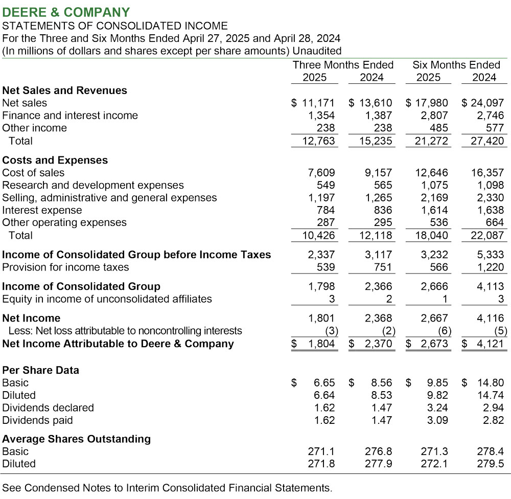 Deere & Company managed to bank net income of US$1.804 billion for the second quarter of 2025. This compares with the net income of US$2.370 billion banked for the same period in 2024.