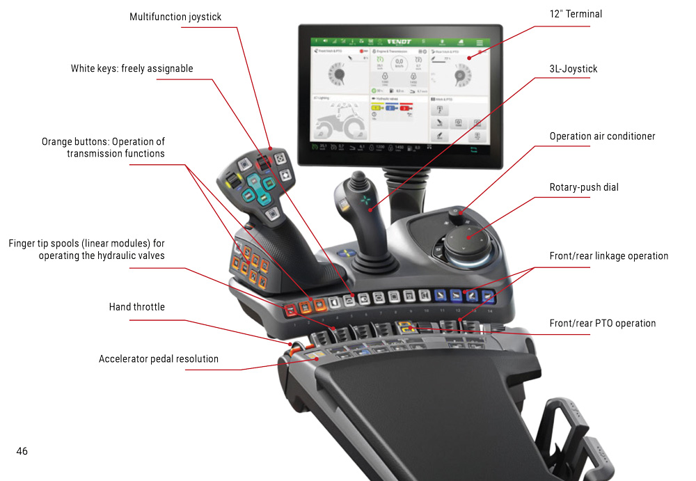In the Fendt 700 Vario Gen7 Series, from the comfort of the cab the tractor and implements are operated simply and individually via the multifunction joystick and the optional 3L joystick through what is termed as FendtONE onboard.