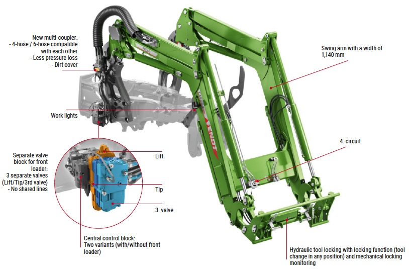 There are separate valves for the front loader, and this ensures that all valves are available at all times at the rear and at the front.