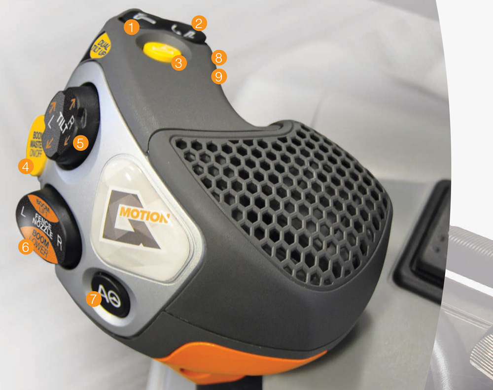 Functions include setting individual or dual boom wing tilt, lifting and lowering while setting the auto steer and cruise control while all master spraying operations can be done without moving your hand from the G-Motion handle.