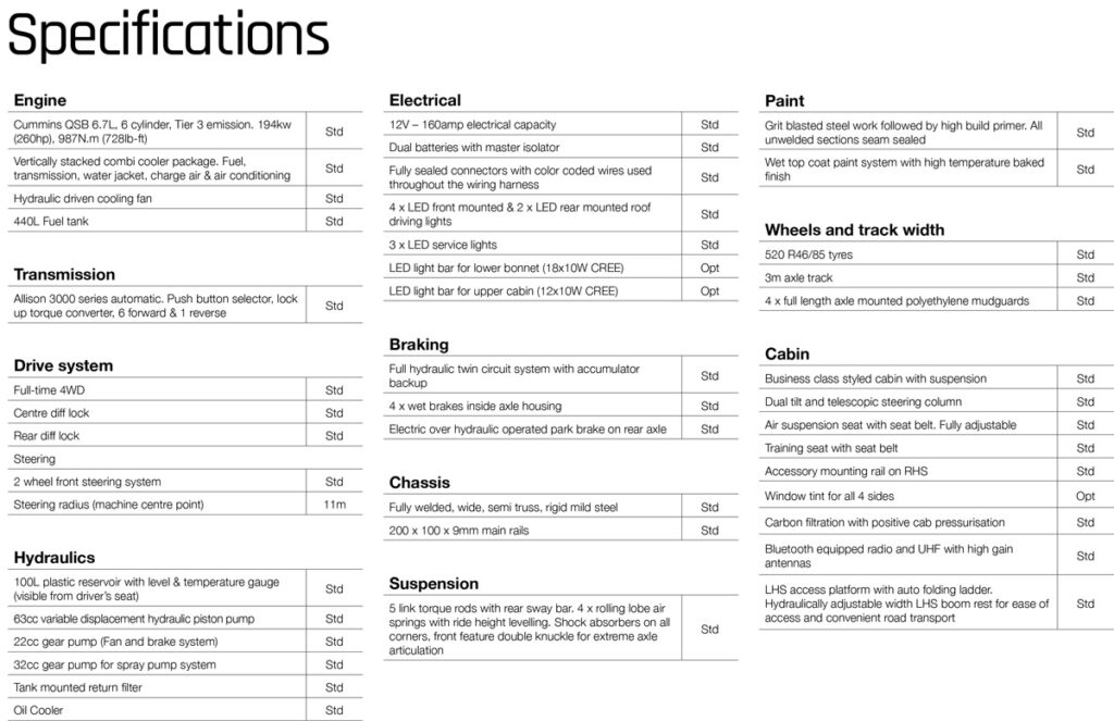 The base specifications have proven ideal for our local terrain, as set into place by Goldacres engineers to give everything expected from a design that includes a fixed three-metre axle with constant four-wheel drive.