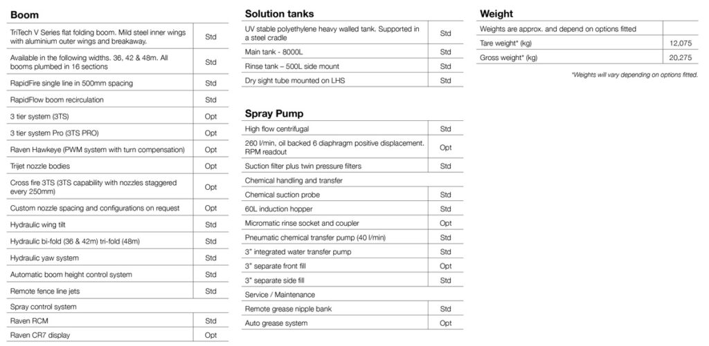 The 48m boom provides for three bi-folding spray widths of 20, 36 and 48 metres at full stretch (65, 120, 160ft), while infinite nozzle spacings further expand spraying flexibility.