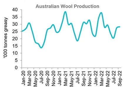 The Australian Wool Testing Authority tested 148,000 bales during September which is down 26,000 on the same month last year. Wet weather across the eastern states is causing delays in shearing which is impacting supply while staples continue to grow.