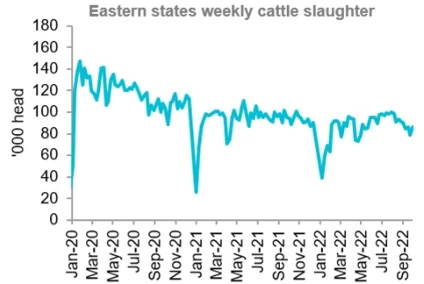 Reduced cattle slaughter will likely see reduced beef export volumes. Exports will also be met by weakened demand. A contributor to weaker demand is the impact of China’s continued lockdowns. In addition, competition from the US has increased in key export markets.