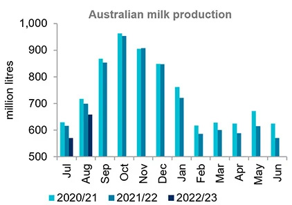 Production is expected to rise in-line with the typical seasonal pattern. This pattern sees national milk production increase 37.8% from August to a peak in October. And while production may increase in the next few months, it is likely to remain subdued compared to last season and average levels.
