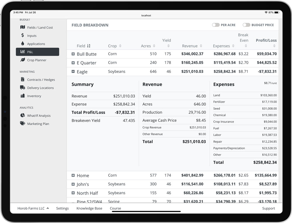 Portable and easy to use, Harvest Profit includes functions such as total farm profit and loss (P&L); field by field and crop by crop P&L; grain contract management; machine data such as hours, usage and cost of farm equipment; scenarios analysis; and grain inventory management.