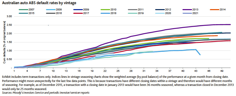Australian auto ABS default rates range from 1.5% to 2.1% for most vintages. The main outlier is the 2013 vintage, which has a default rate of 2.5%.