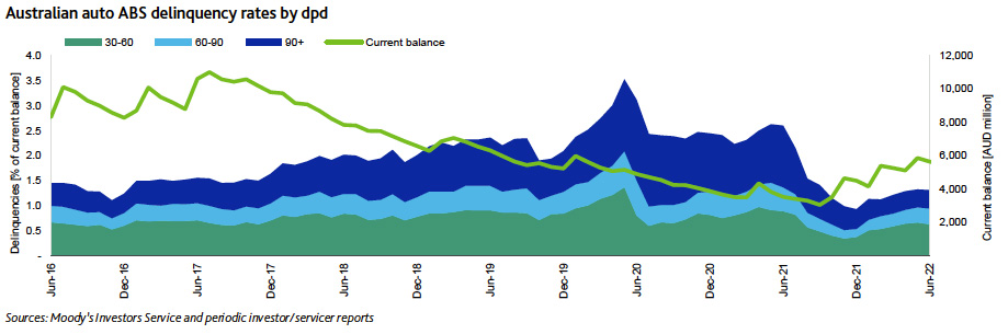 Australian auto loan ABS delinquency rates increased in June compared with March 2022. The average 30+ days delinquency rate for Australian auto ABS was 1.32% in June, compared with 1.22% in March and 2.60% in June 2021.