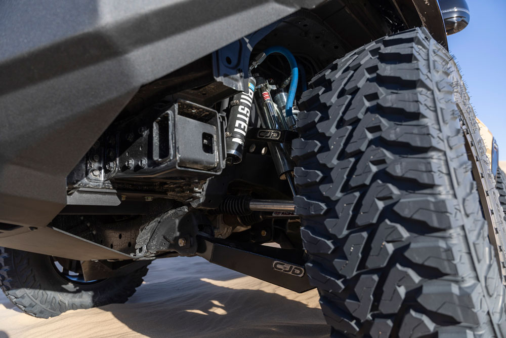 - Custom CJD Racing long travel race suspension system increasing the factory suspension up to 406mm (16-inches) of travel