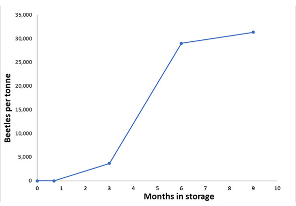By the end of January, the population had multiplied to 12,000 per tonne and by late March, there were 29,000 lesser grain borers per tonne.