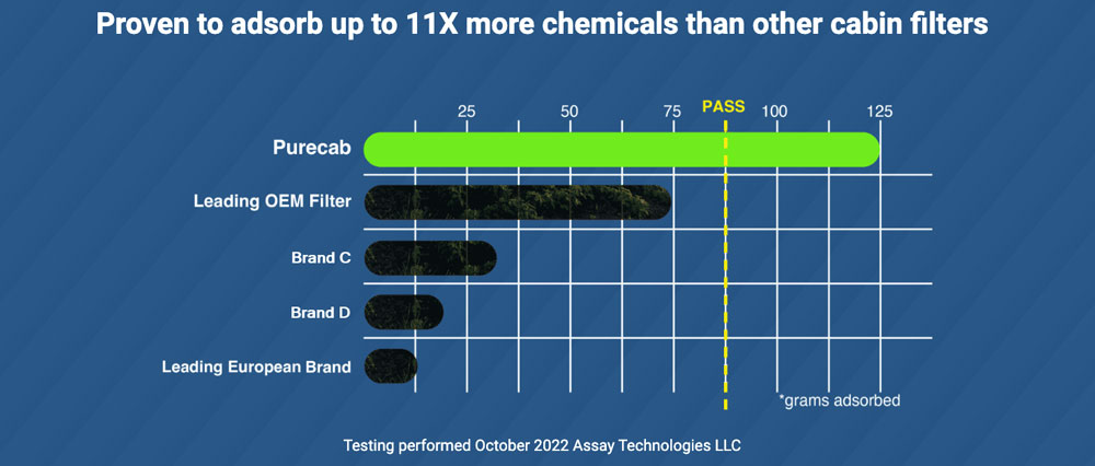 Your cabin filter new installation or upgrade will be in safe hands as Purecab uses ADXORB Activated Carbon to deliver a higher level of protection that has been proven to offer up to 11-times more chemical adsorption than competitors.