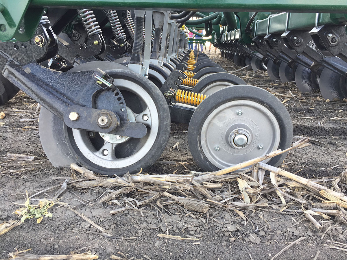 The units share the dual accumulator system of the Allrounder, with the addition of an adjustable cam to dial in the balance of pressure between break-out and packing force on the press wheel, necessary to avoid over packing the seed bed.