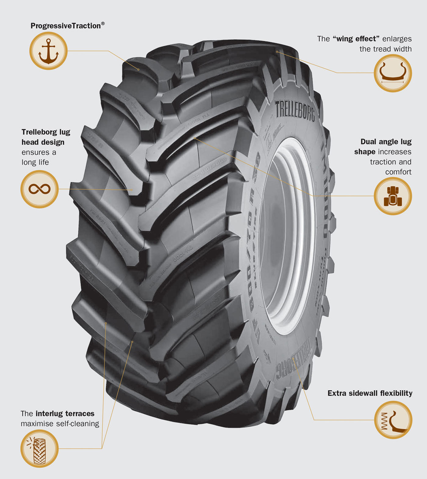 The ProgressiveTraction tread design was conceived to tackle the requirements of the latest generation of machinery, increasing power transmission efficiency to the ground while reducing soil compaction.